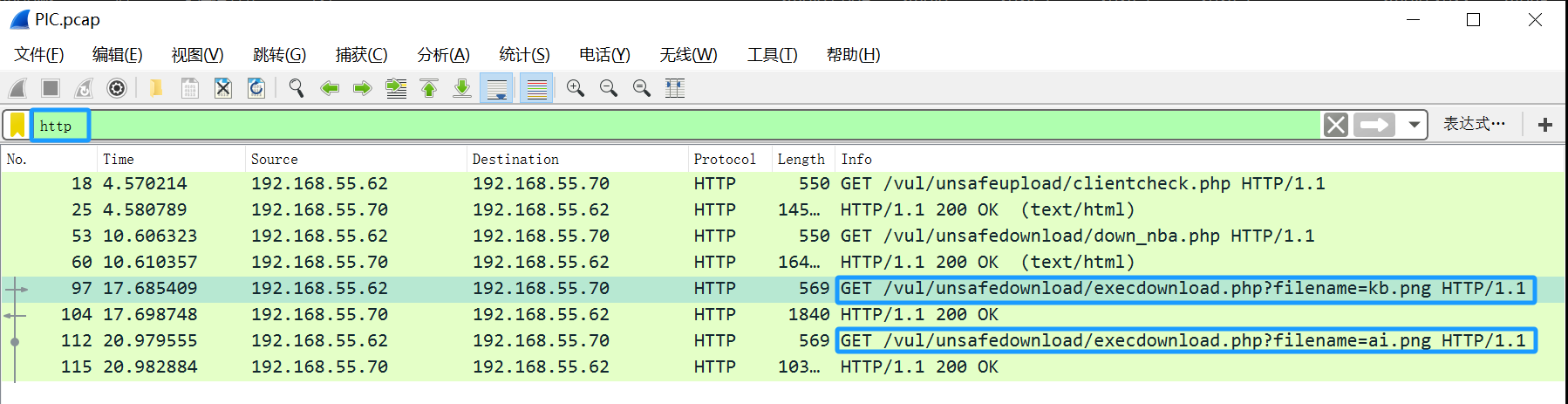 1.1 使用Wireshark过滤http,查找到两个GET请求的png图片