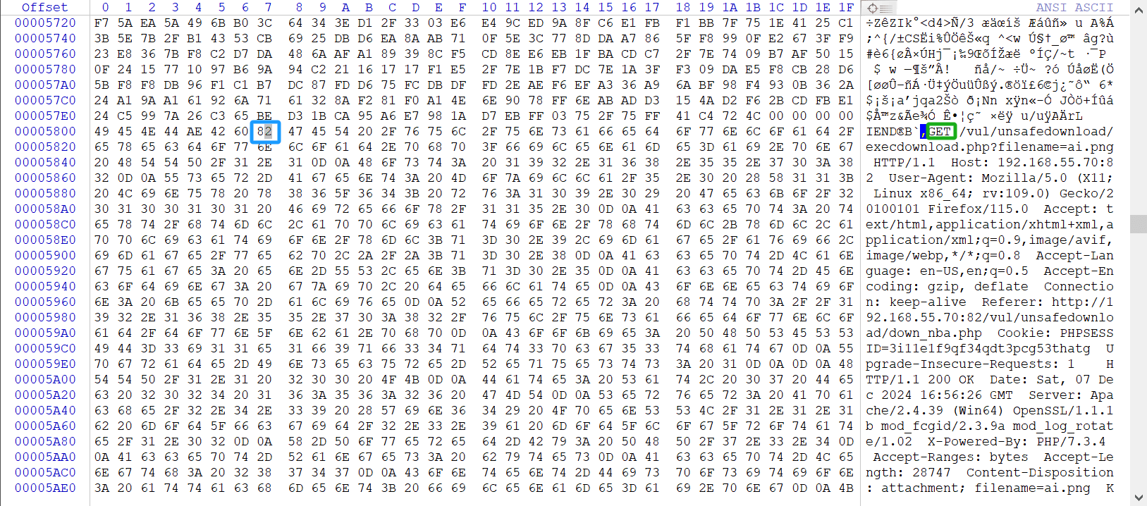 点击GET字样左侧的字符,左侧十六进制会有同步提示