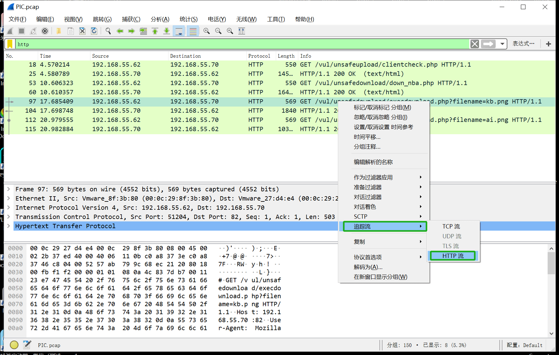 1.2 对其中一个右键单击,追踪流–>HTTP流