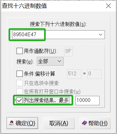 2.2 png图片文件头十六进制为89504E47,然后勾选列出所有结果